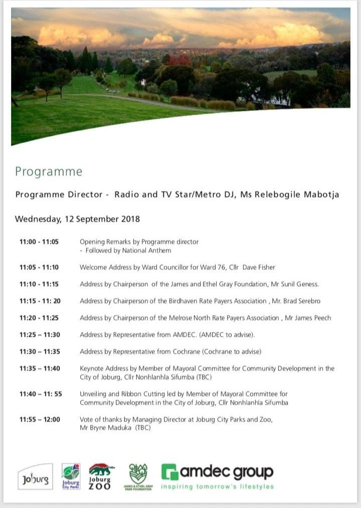 In an effort to answer the call by government to the Private Sector, NGO’s and individuals to work together towards doing more for the Citizens of the City of Johannesburg - and in light of existing resource constraints, the Birdhaven Rate Payers Association, the Melrose North Residents and AMDEC (the Melrose Arch Management company) joined forces to establish the James and Ethel Gray Park Foundation for the purpose of partnering with JCPZ through the adoption of the James and Ethel Gray Park.